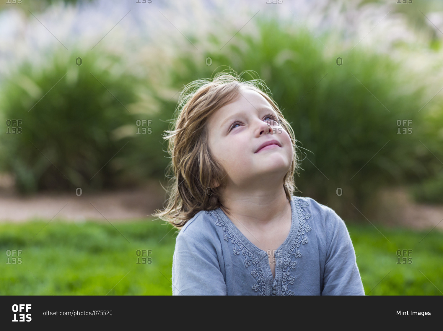 5 year old boy relaxing on lush green lawn looking up