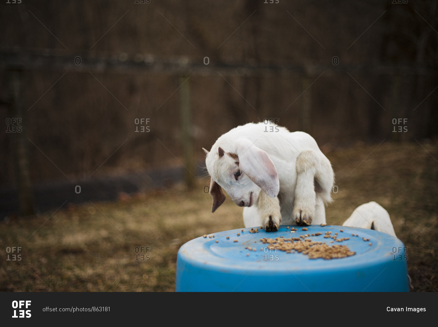 A baby goat eating food on top of a blue buckets
