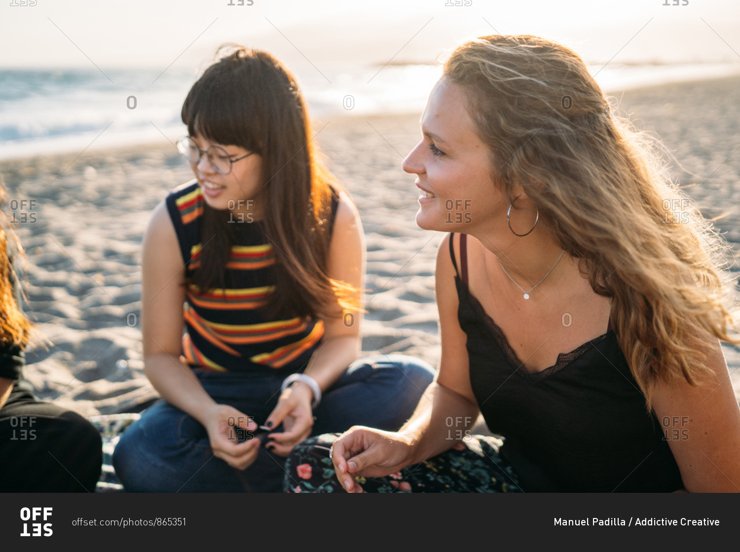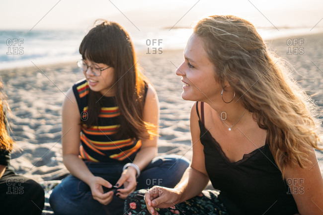 A beautiful blonde girl chatting with her group of friends on the beach, next to her Asian friend