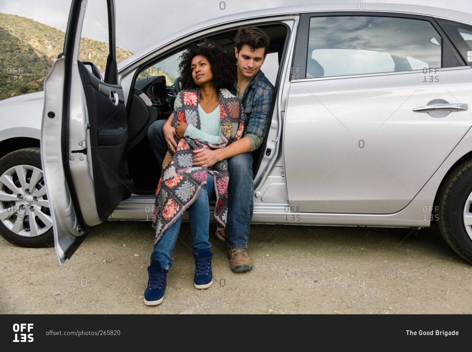 A couple cuddles in the front seat of a parked car