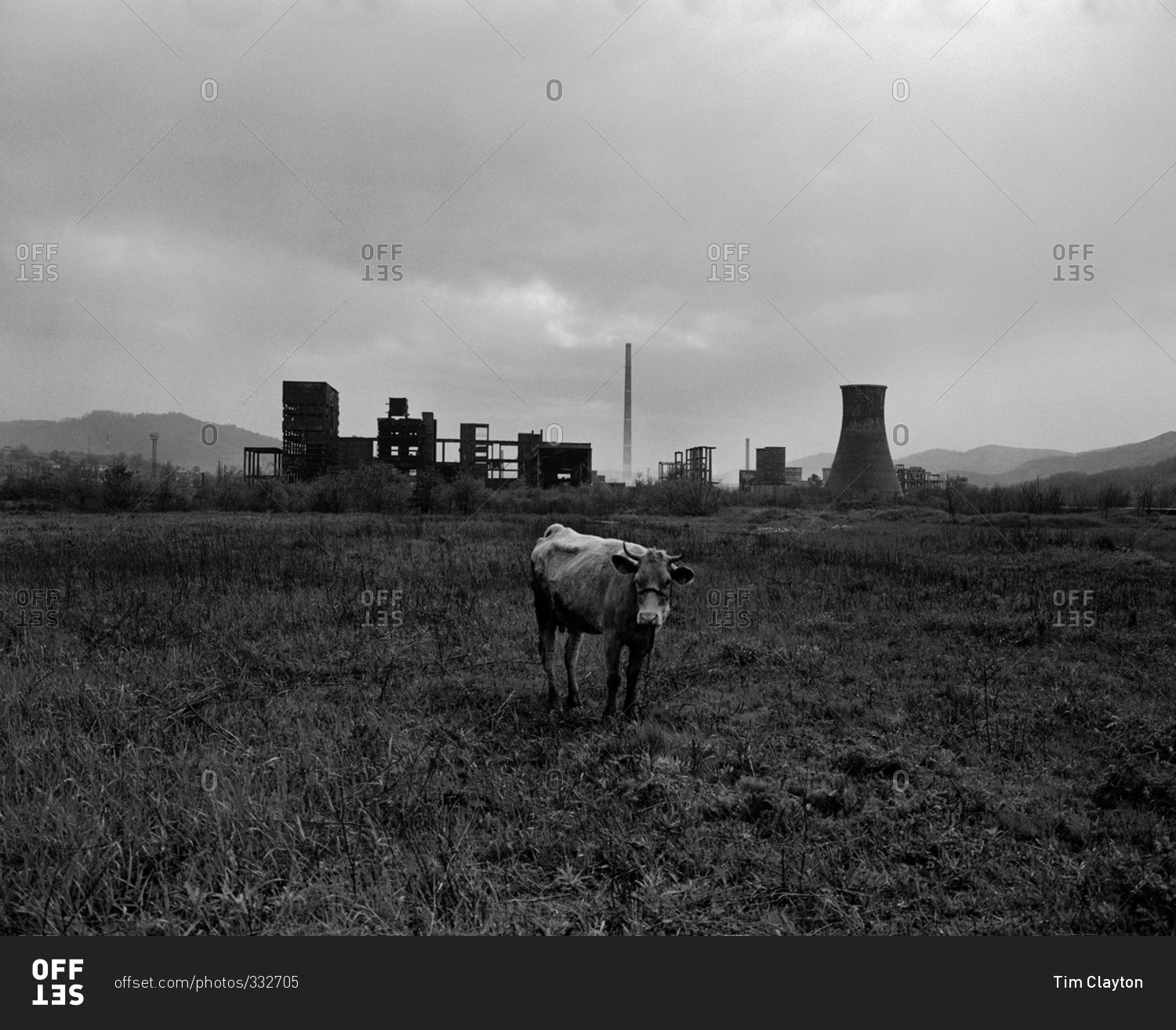 A cow standing alone, tethered in a field on the outskirts of Copsa Mica, Transylvania, Romania