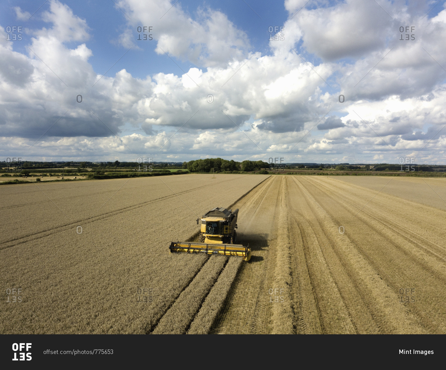 A drone shot of fields in a farming landscape, and a combine harvester working harvesting a crop.