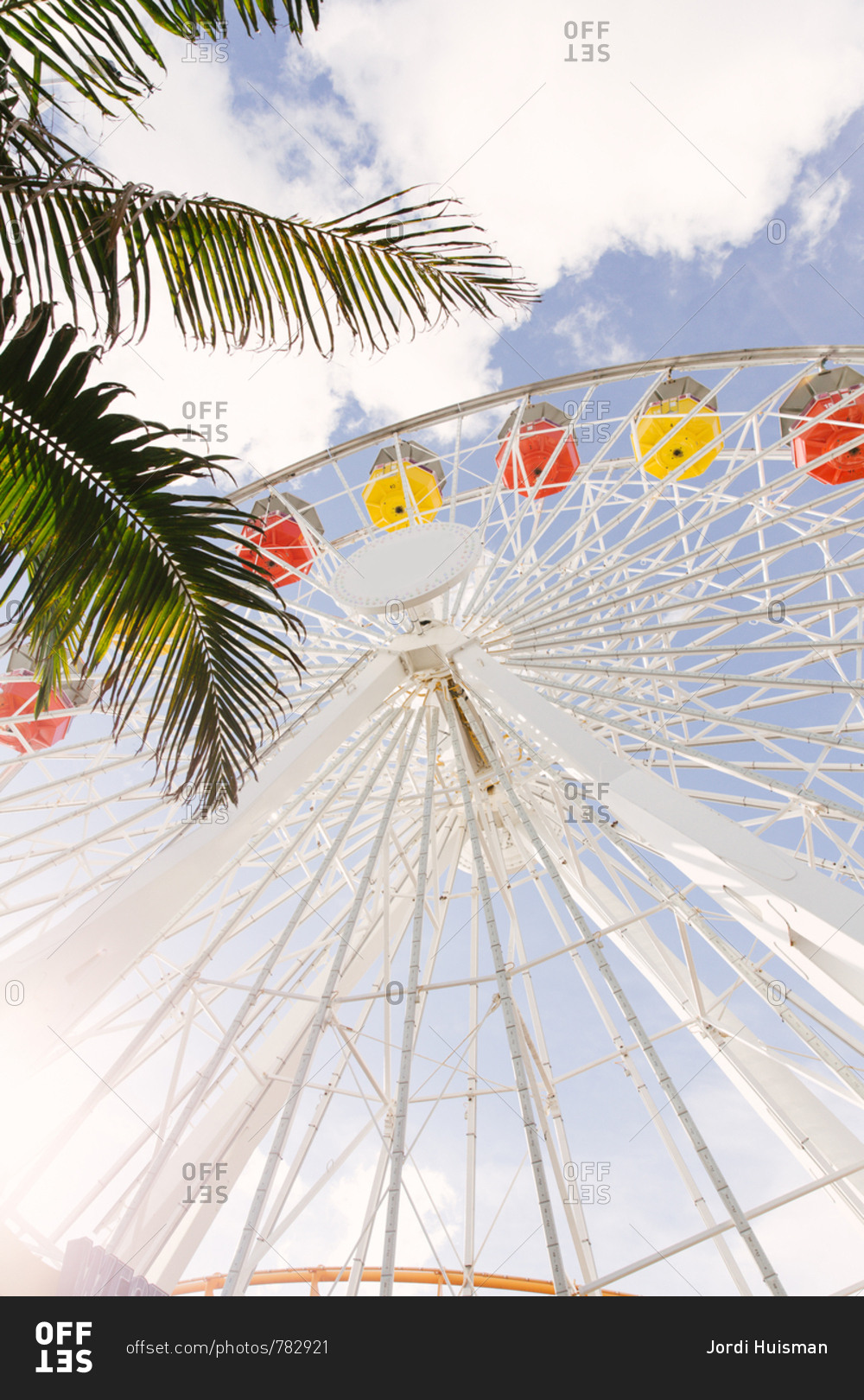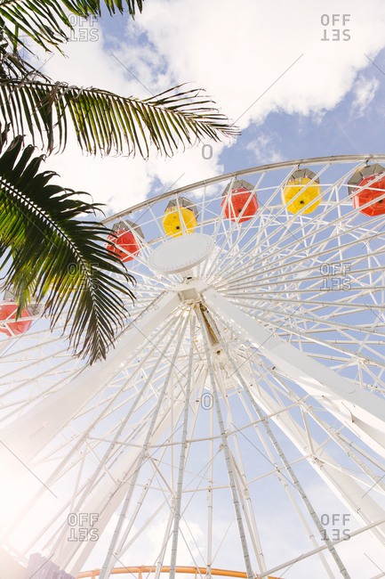 A ferris wheel with exotic leaves in the foreground somewhere in California.