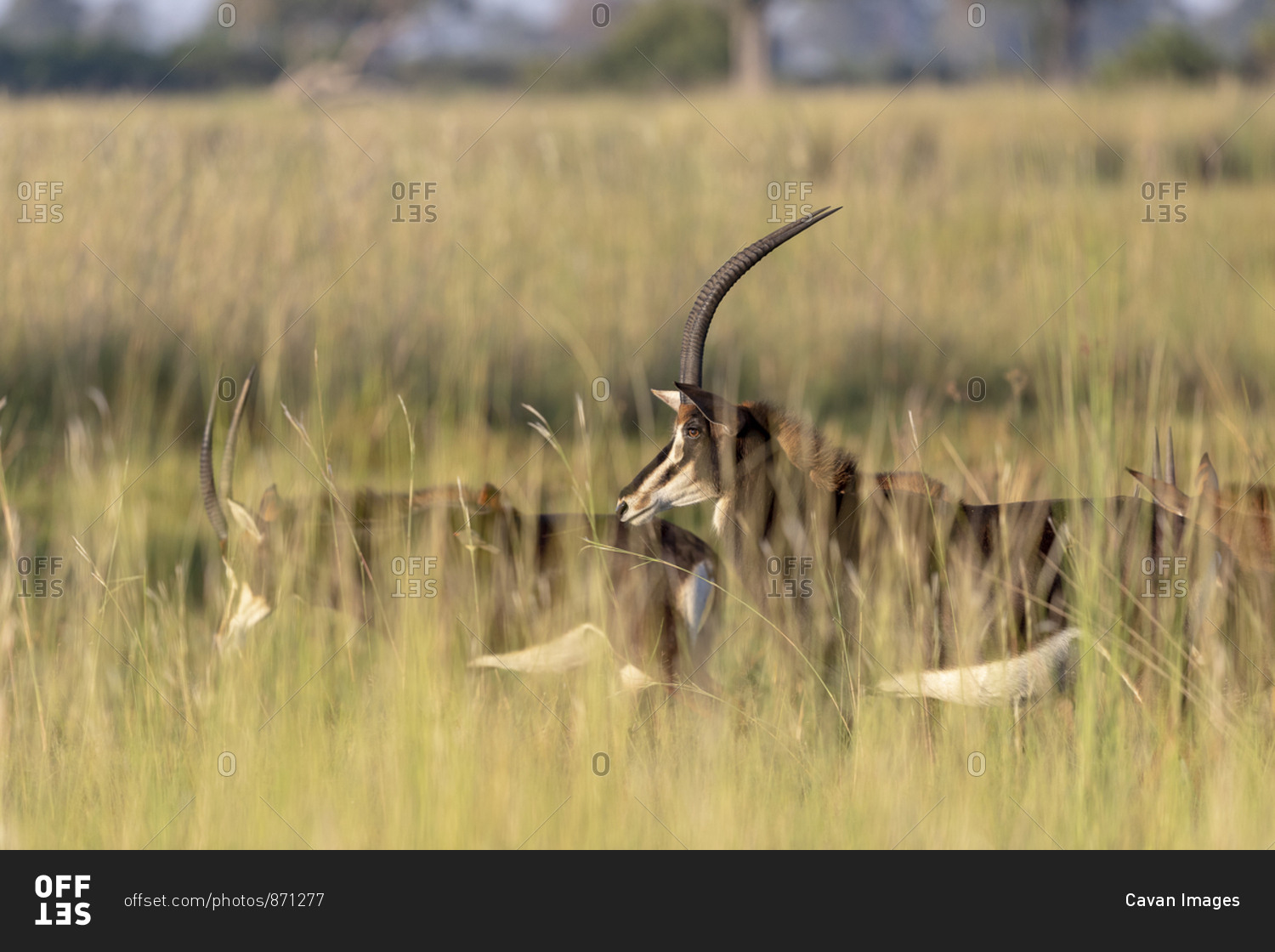 A group of sable antelope walks in the savannah through tall grass