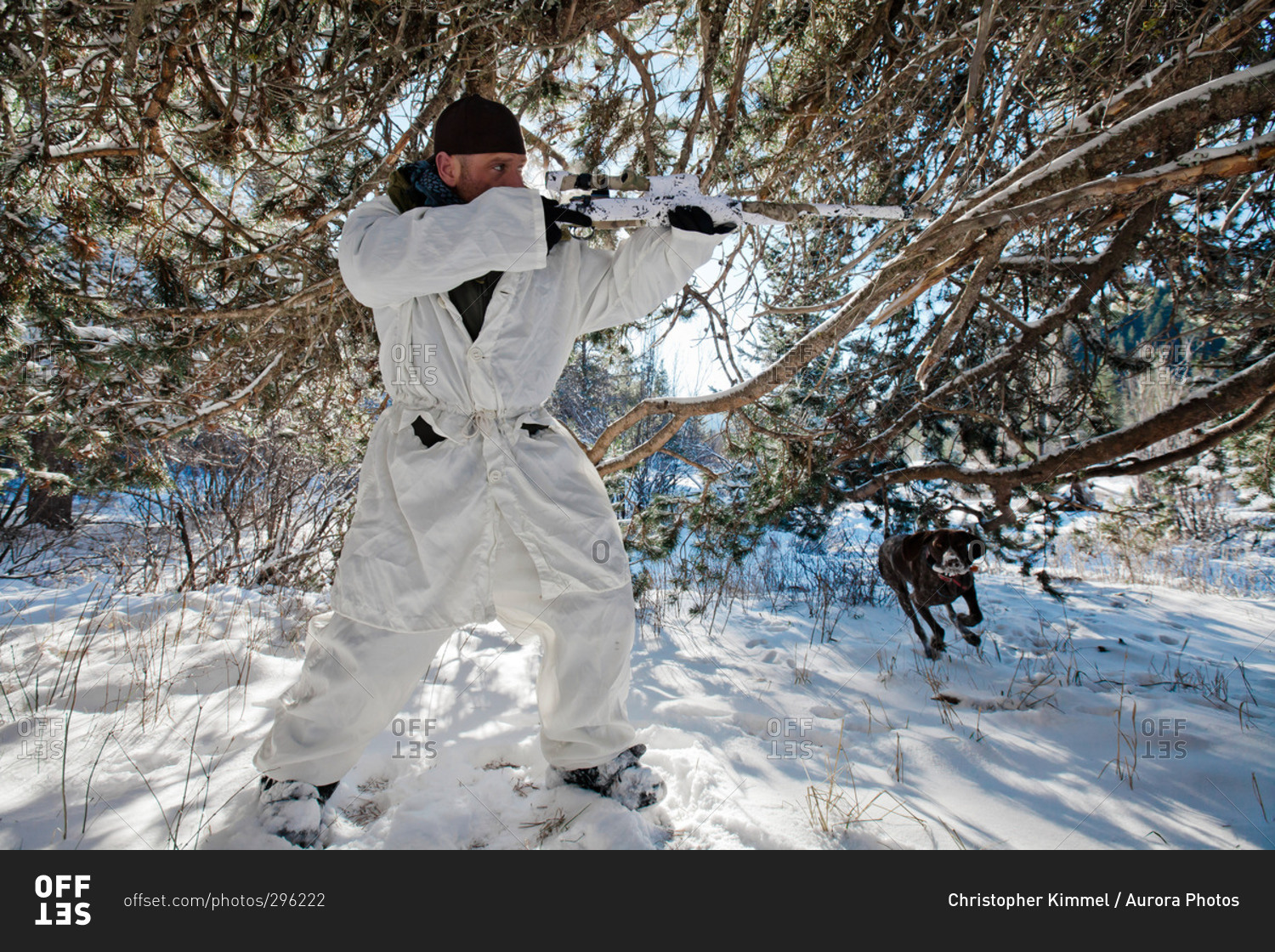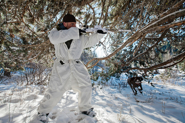 A hunter wearing a cold-weather camouflage outfit aims his rifle in preparation to shoot while his hunting dog prepares to retrieve