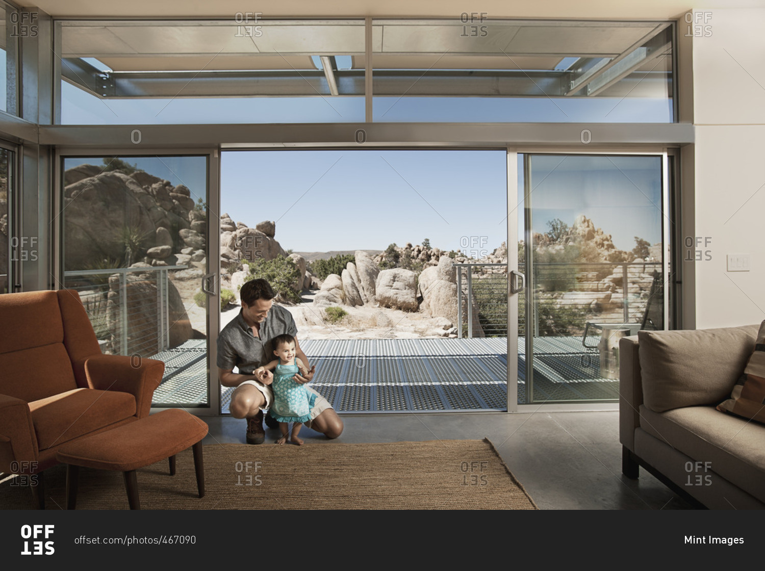 A man and a young child in an ecohouse, a home with large glass walls and view out over the rocky landscape