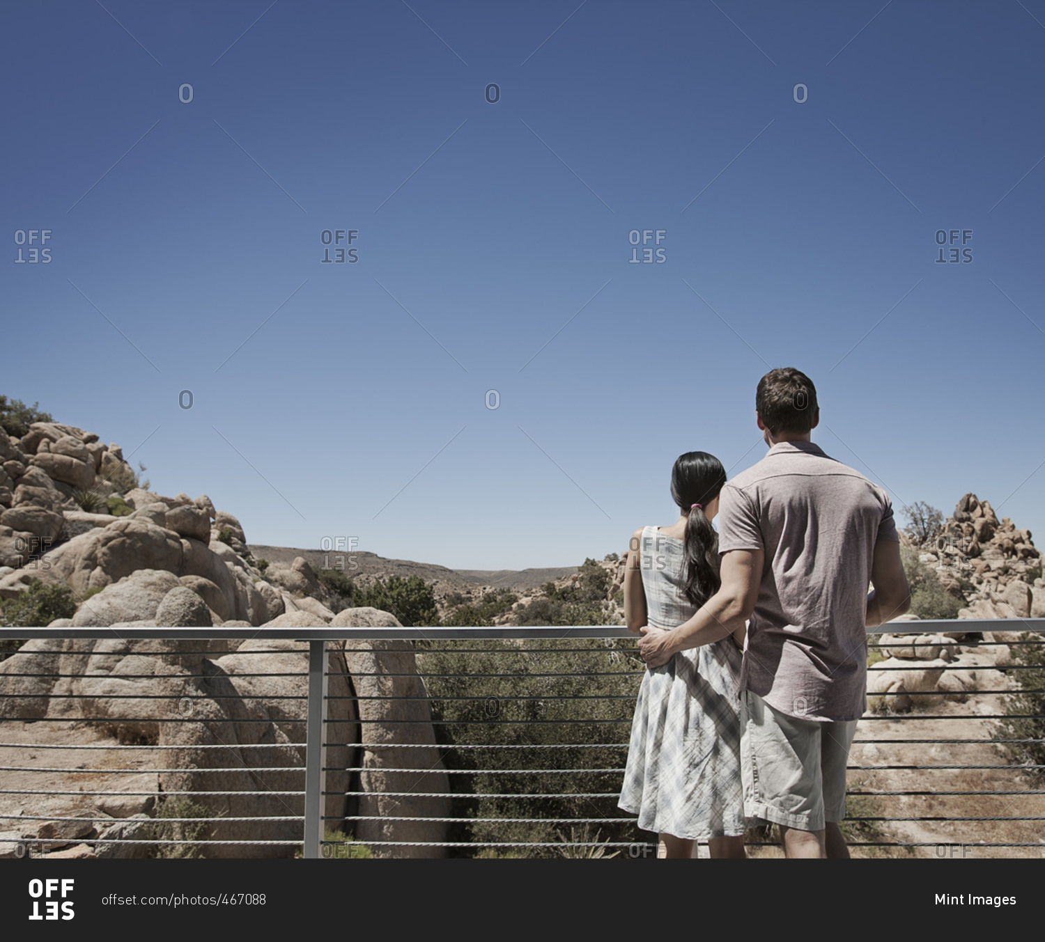 A man and woman on the terrace of an eco house, looking over the rocky landscape