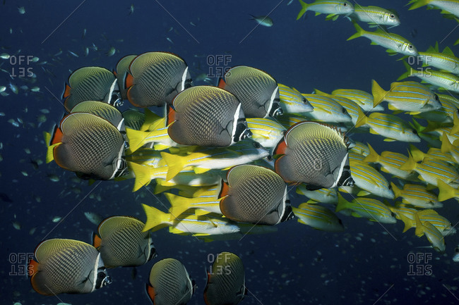 A Mixed School Of Collare Butterflyfish, Chaetodon Collare, And Blue Lined Snapper, Lutjanus Kasmira