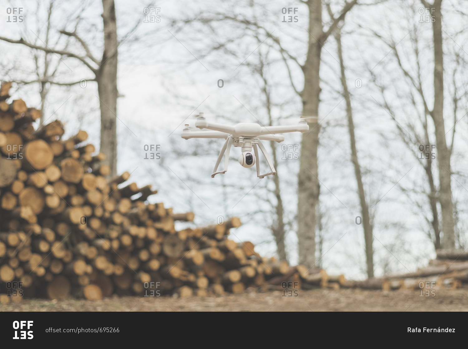 A quadcopter drone flies near a stack of logs