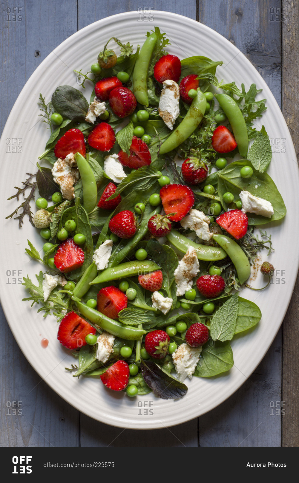 A salad of greens, sugar snap peas, strawberries, mint and goat cheese with a balsamic vinaigrette
