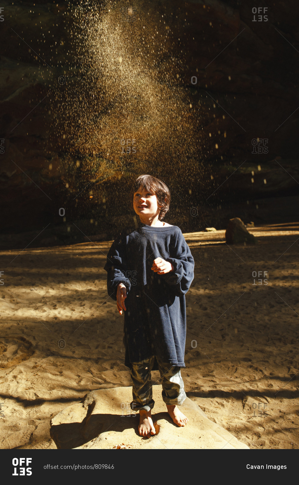 A small barefoot child throws golden sand into the air in sunlit gorge