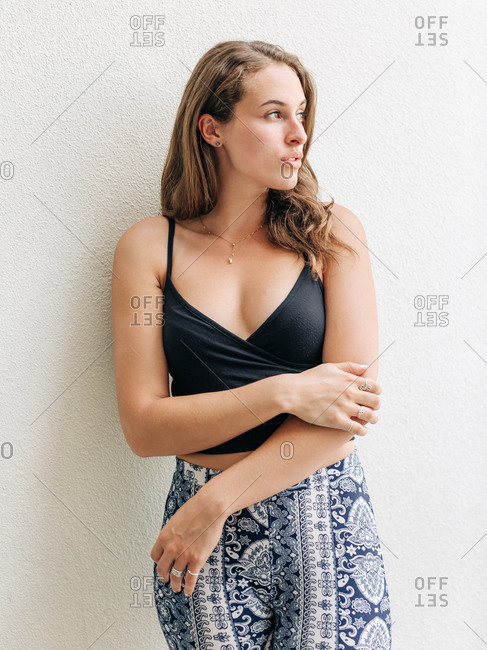 A white woman with light brown hair against a white wall looking to the side with arms crossed