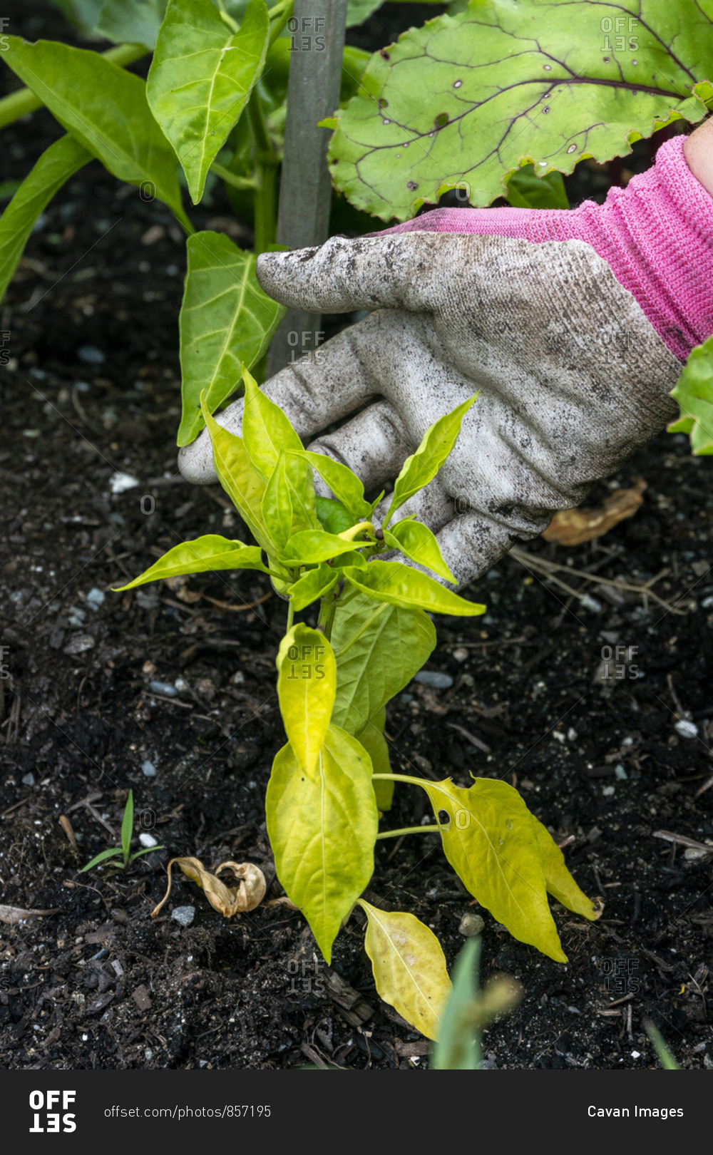 A women shows off a jalepeno plant in her backyard vegetable garden.