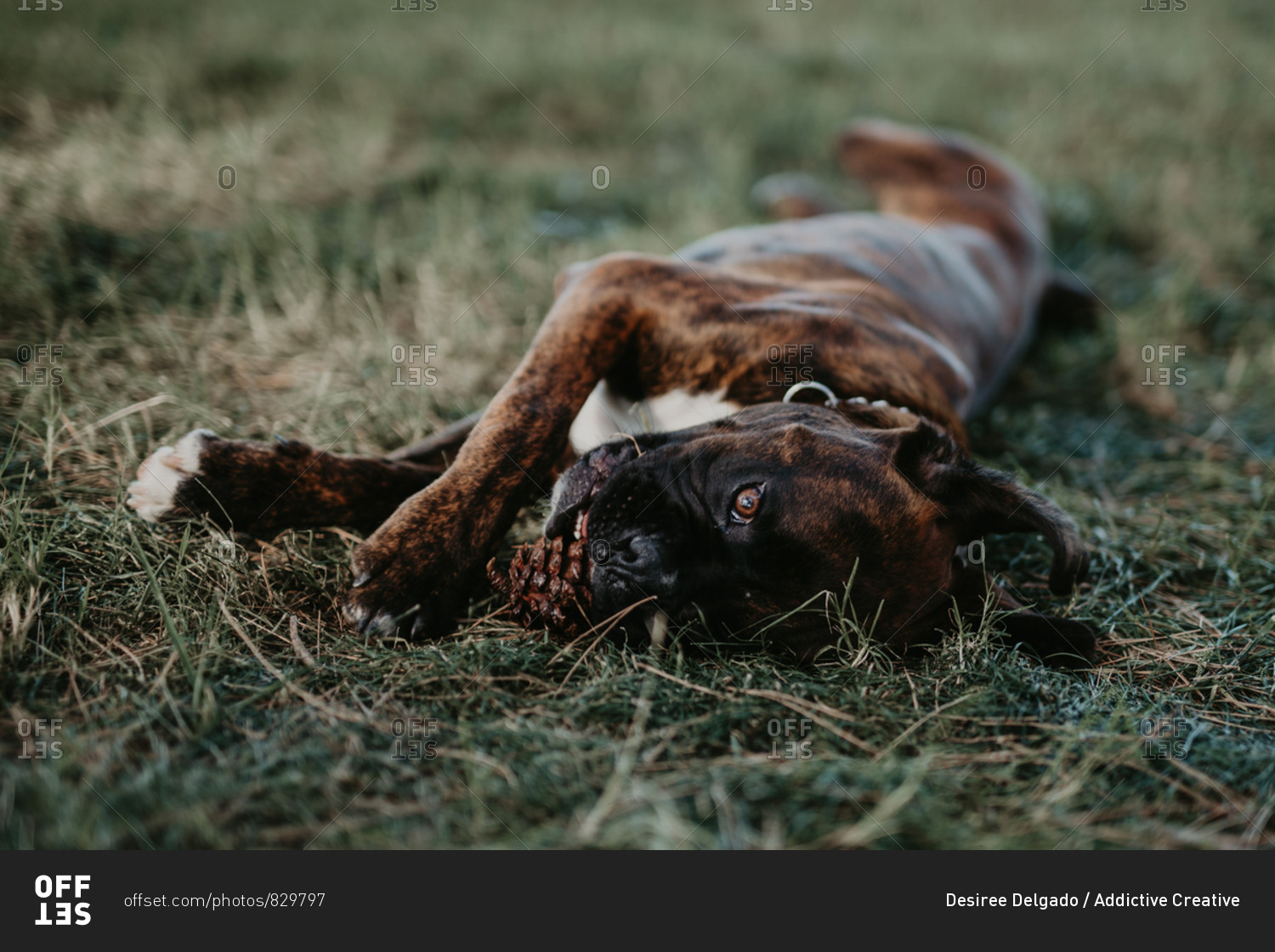 Adorable strong brown boxer dog playing and laying in green lawn with cone