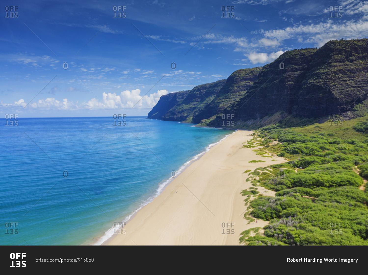 Aerial by drone of Polihale State Park beach, Kauai Island, Hawaii, United States of America, North America