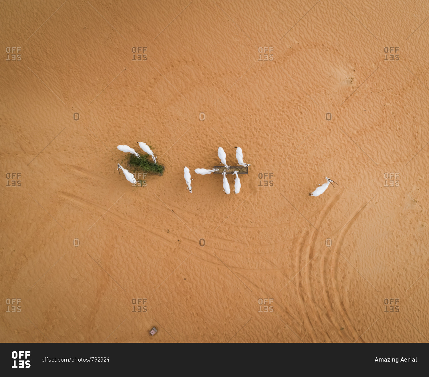 Aerial view above of group of goats eating on desert landscape, Abu Dhabi, U.A.E