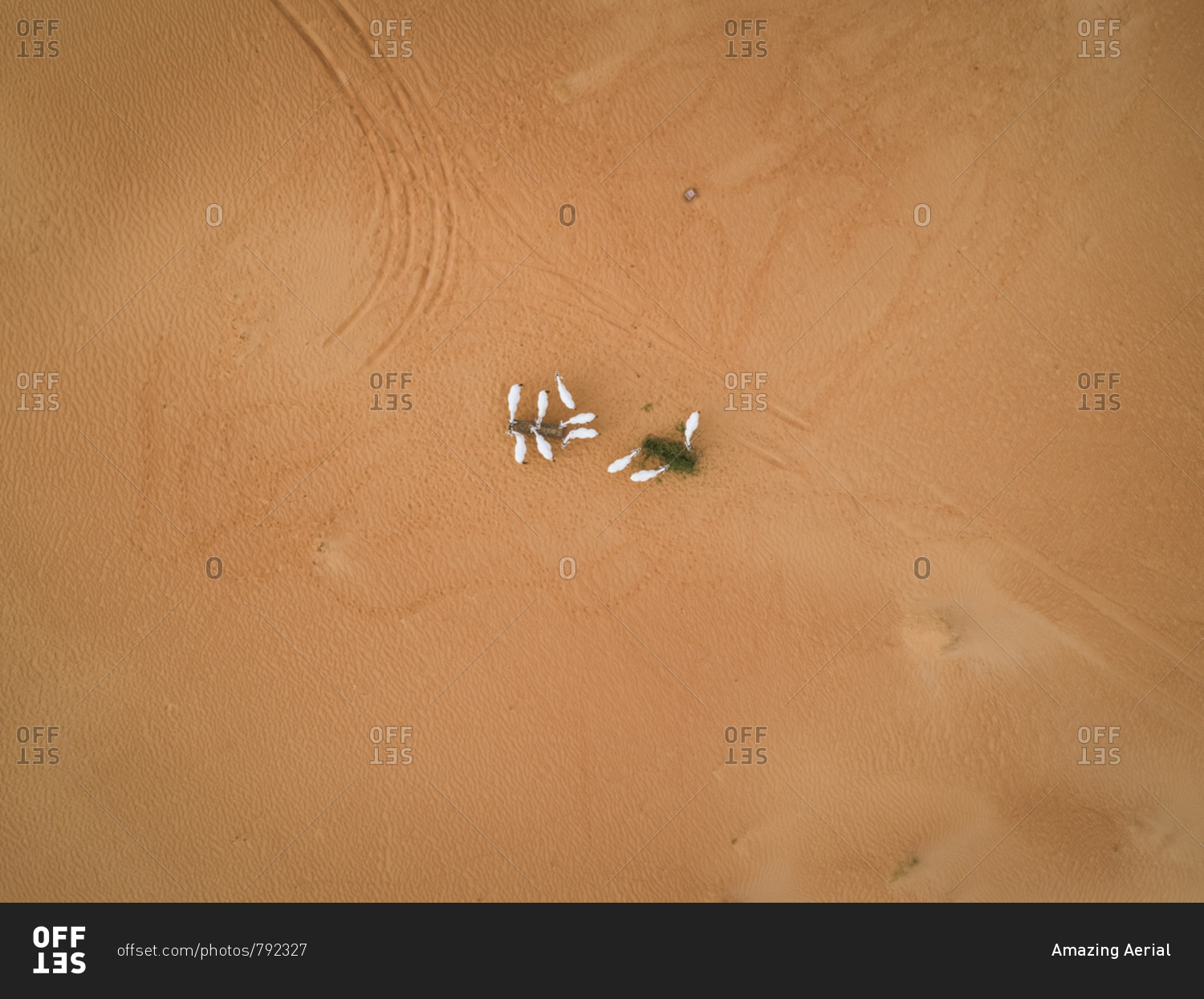 Aerial view above of group of goats eating on desert landscape, Abu Dhabi, U.A.E