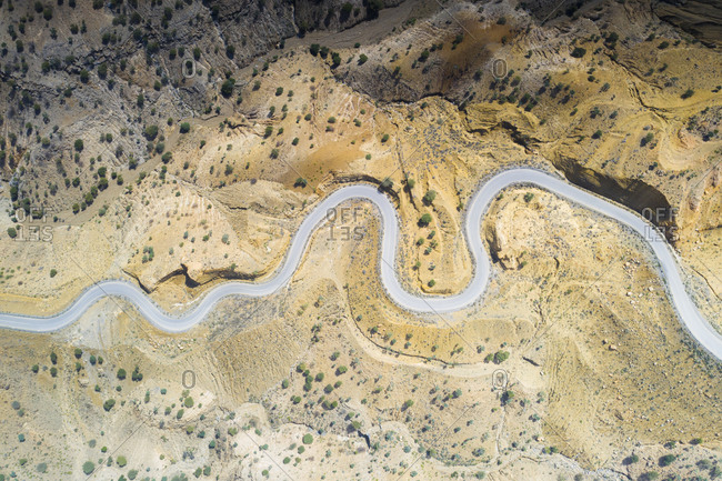 Aerial view by drone of hairpin bends of empty road along Danakil desert from above, Afar Region, Ethiopia, Africa