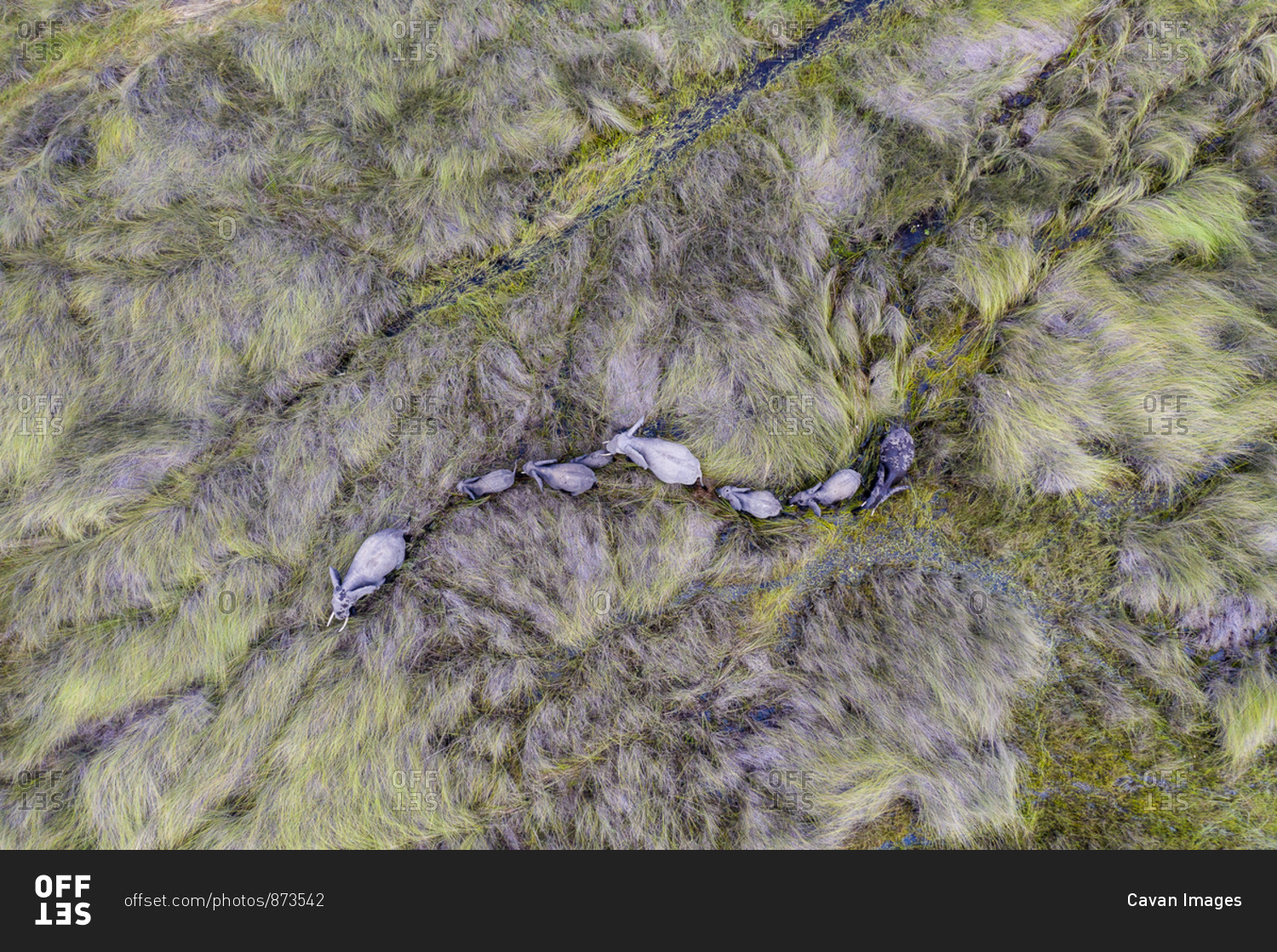 Aerial view of elephants walking in single file in tall grass
