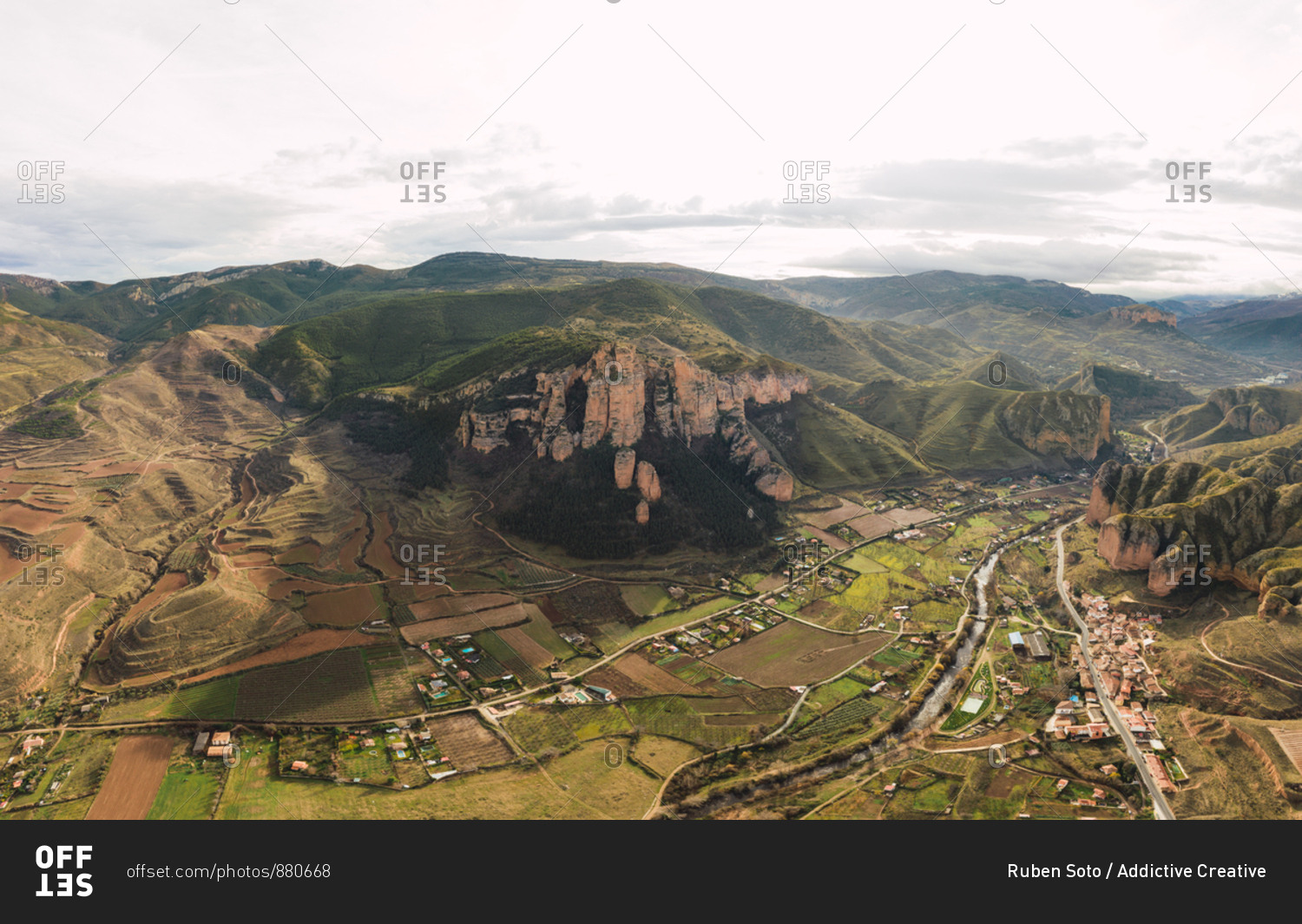 Aerial view of mountain chain and village landscape in Islallana, La Rioja, Spain
