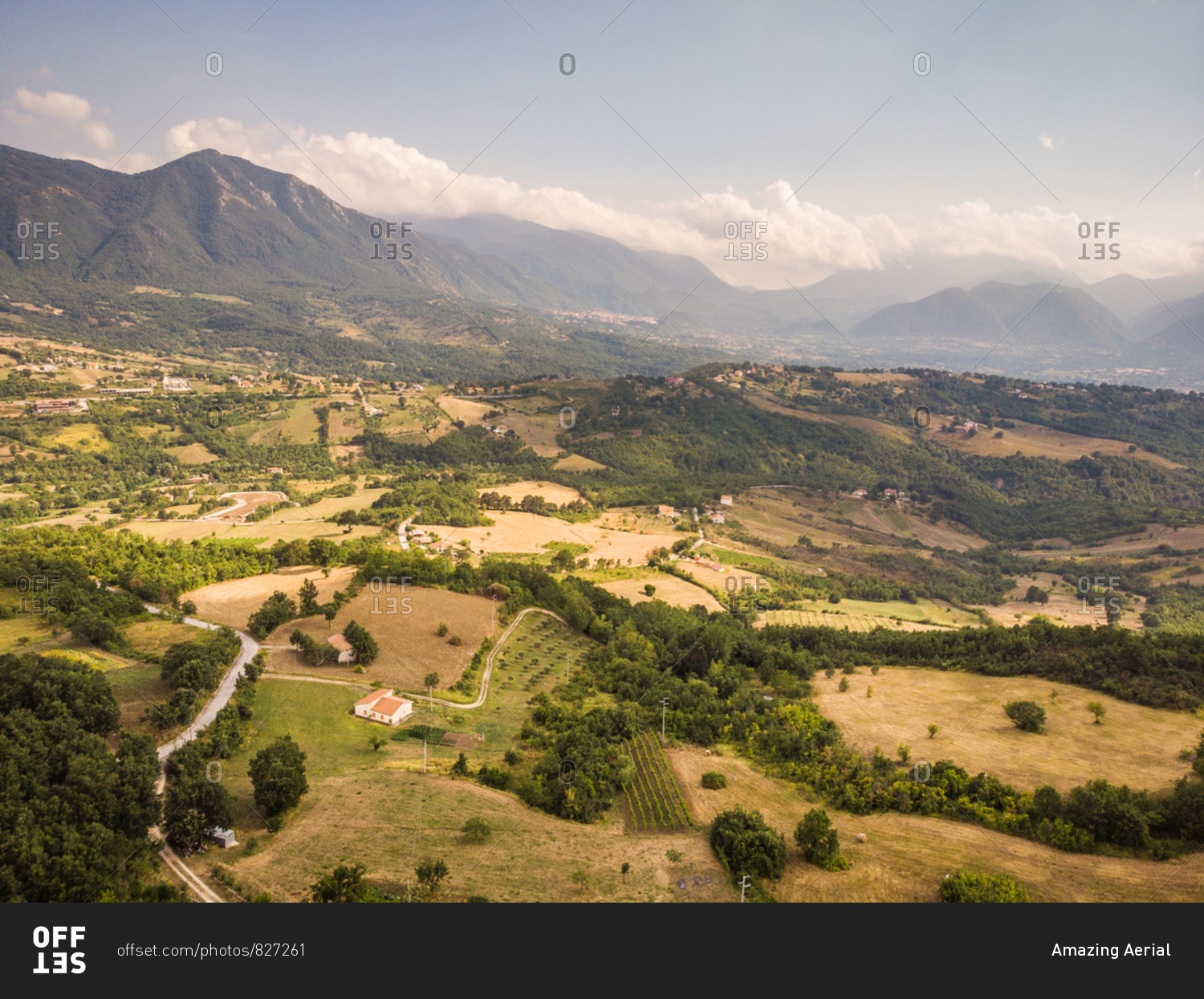 Aerial view of rolling hills, mountains and country lanes in Avellino Province, Campania, Southern Italy.