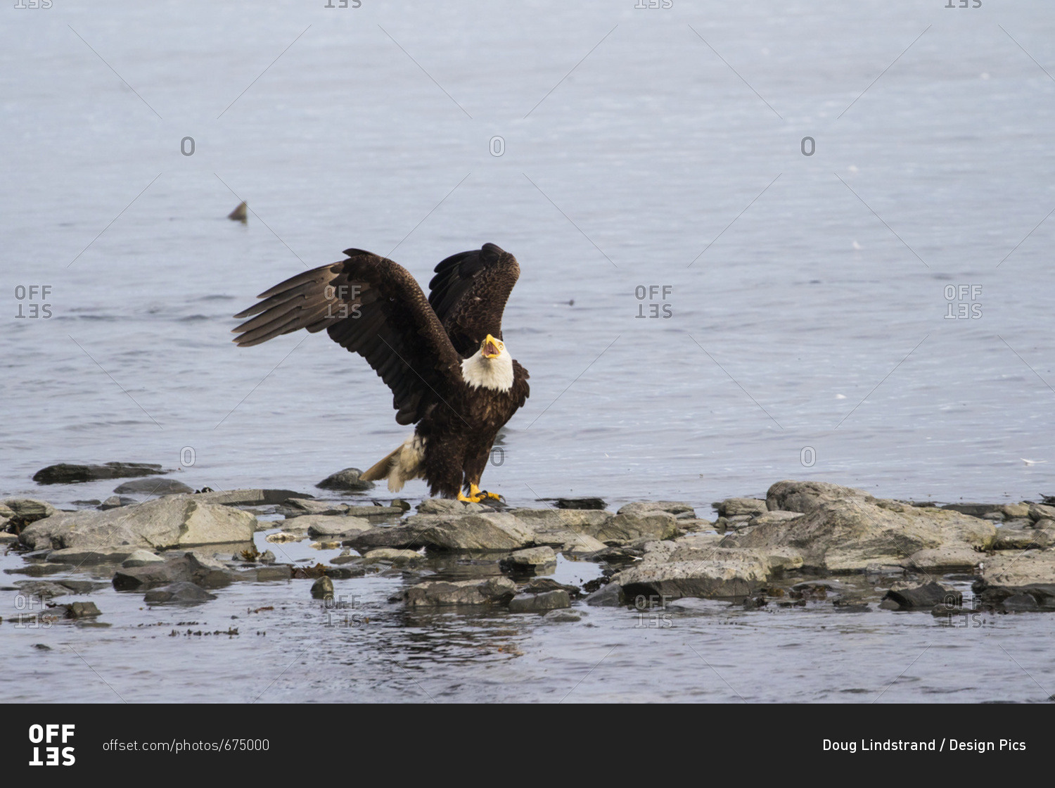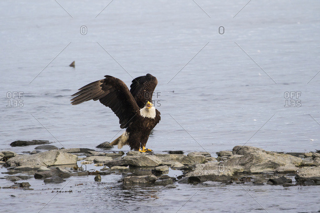 Alaska, United States of America - July 12, 2016: A Mature Bald Eagle (Haliaeetus Leucocephalus) Sits On Shoreline And Fends Off Other Eagle While Fishing For Salmon At The Fish Hatchery, Allison Point, Outside Of Valdez; Alaska, United States Of America