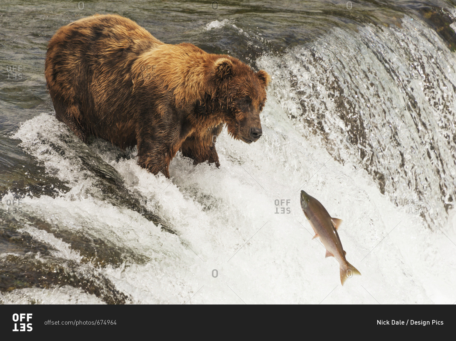 Alaska, United States of America - July 29, 2015: A Brown Bear (Ursus Arctic) With A Scar On It's Back Staring At A Salmon Just Feet Away From It's Mouth, Brooks Falls; Alaska, United States Of America