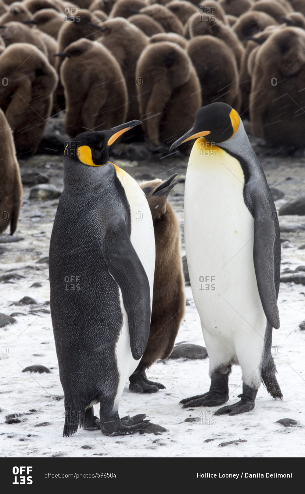 Antarctica, South Georgia Island, Salisbury Plain, King Penguins and Chick