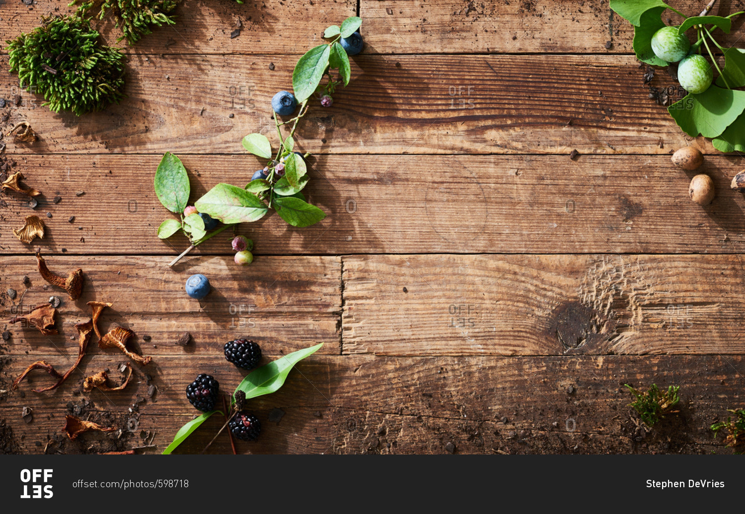 Arrangement of wild mushrooms and berries with moss on wooden background