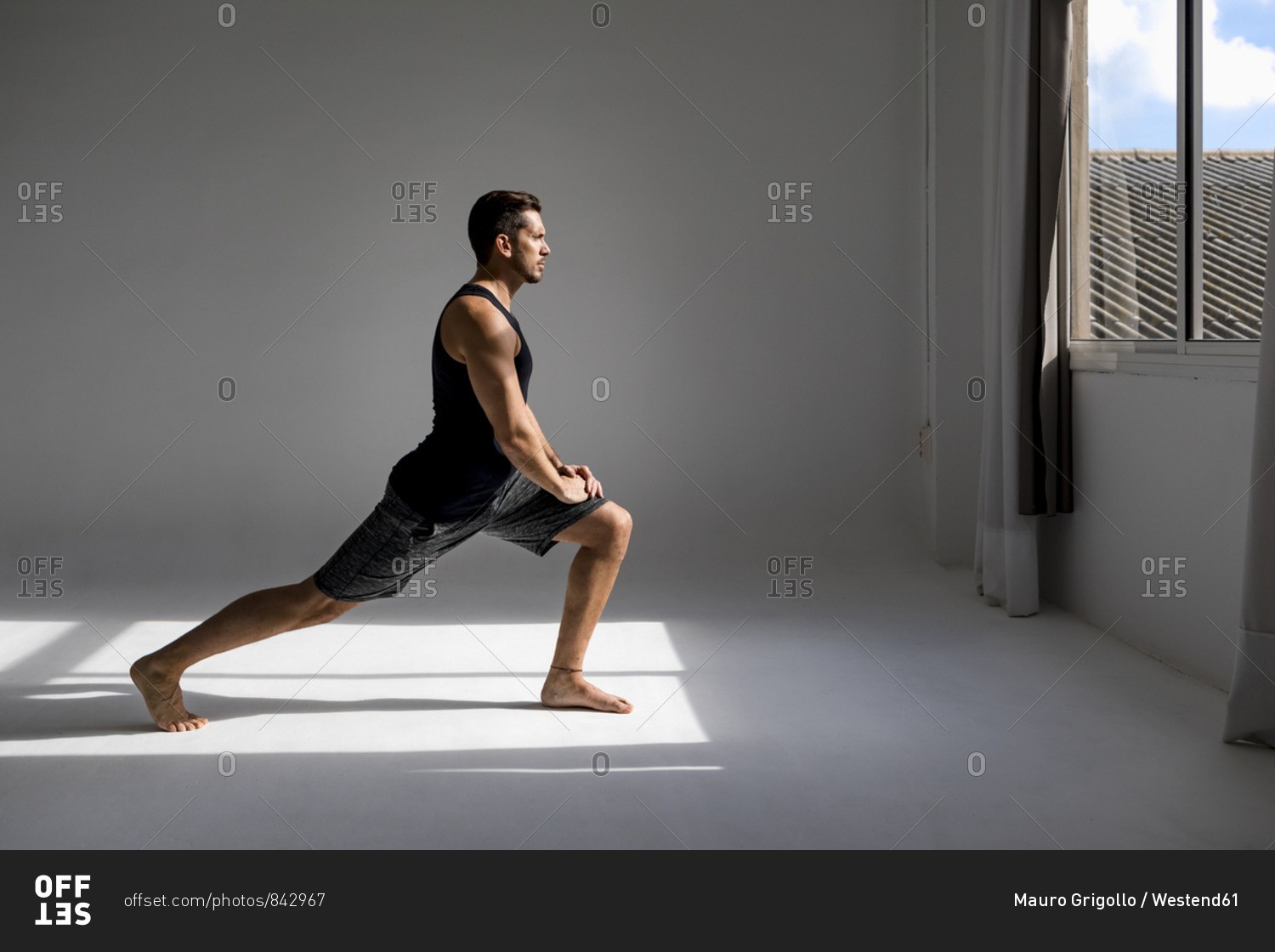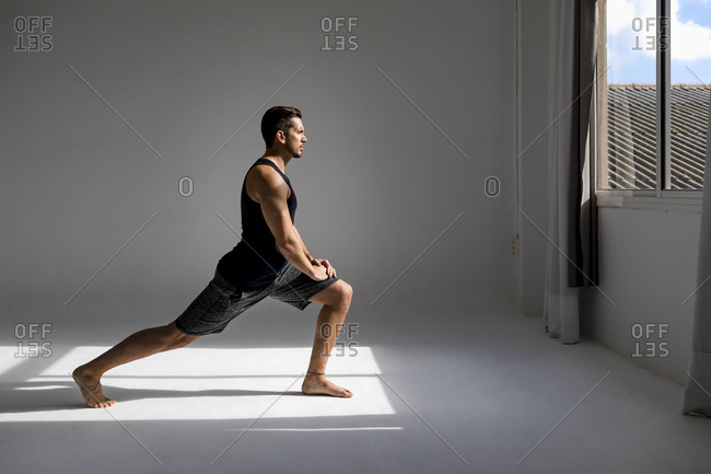 Athlete worming up in sunlit studio
