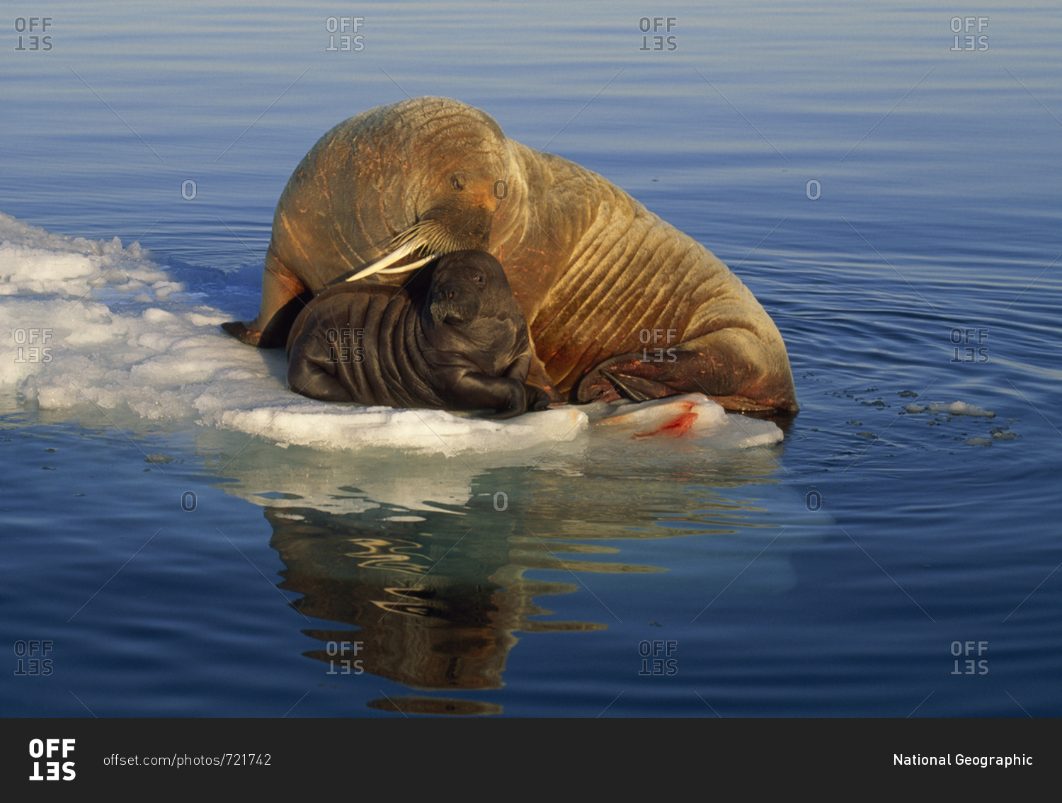 Atlantic walrus and newborn pup on ice in midnight sunlight.