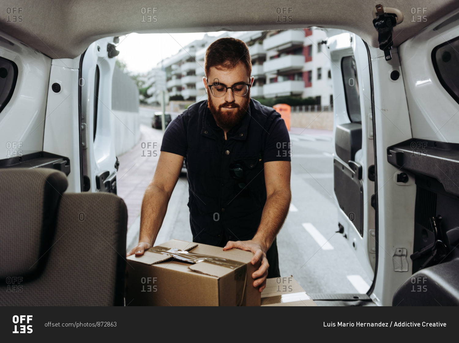 Attentive adult bearded courier in glasses carefully unloading cardboard boxes from car for further delivery to customer on blurred background during daytime