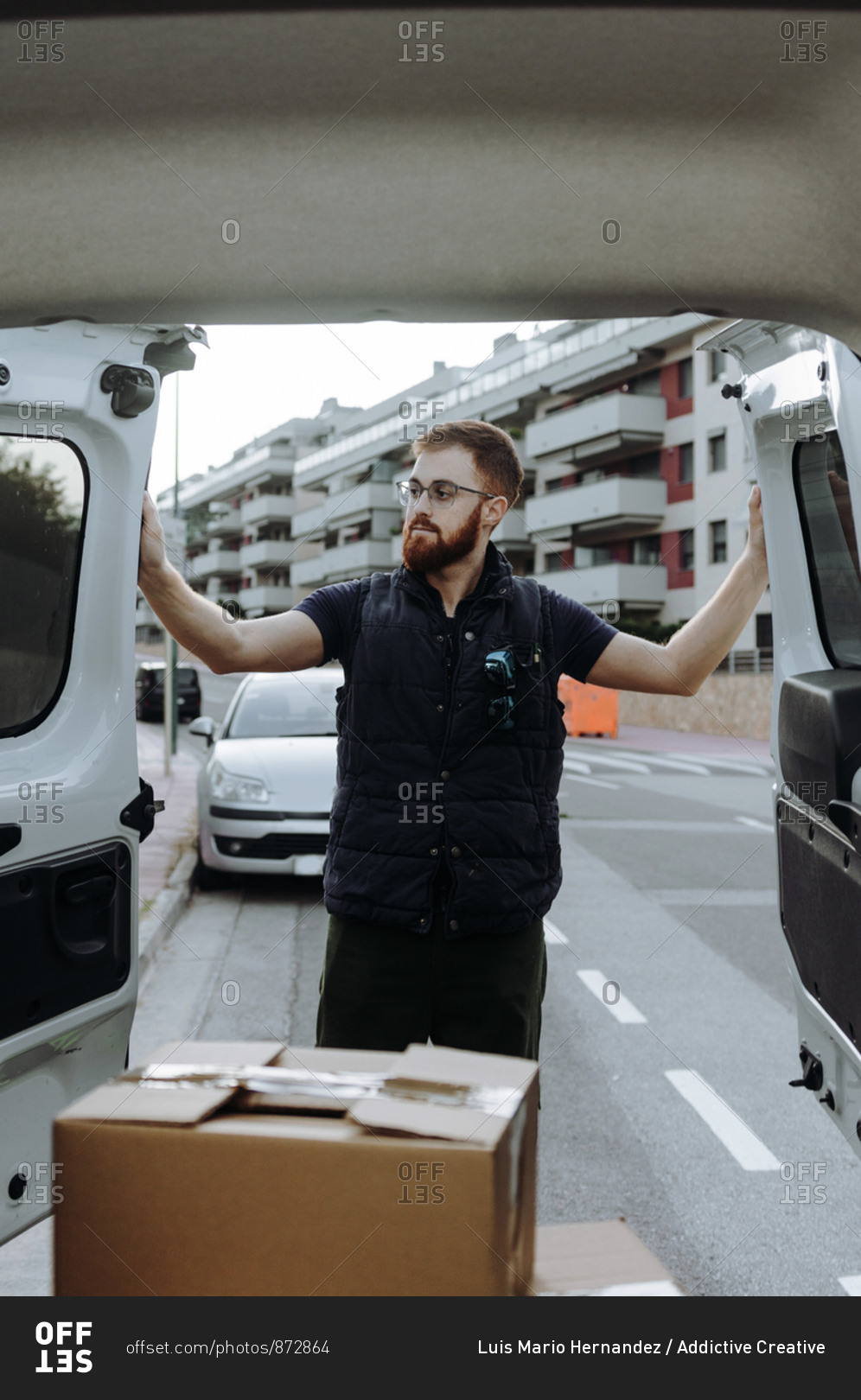 Attentive adult bearded courier in glasses carefully unloading cardboard boxes from car for further delivery to customer on blurred background during daytime