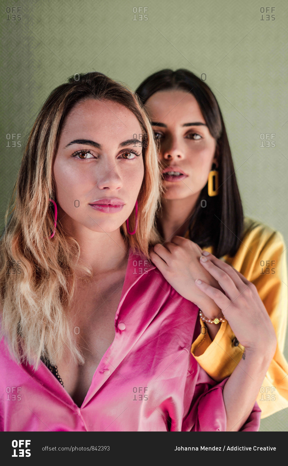 Attractive stylish gorgeous calm females in vibrant fashionable outfit looking at camera confidently while touching hands