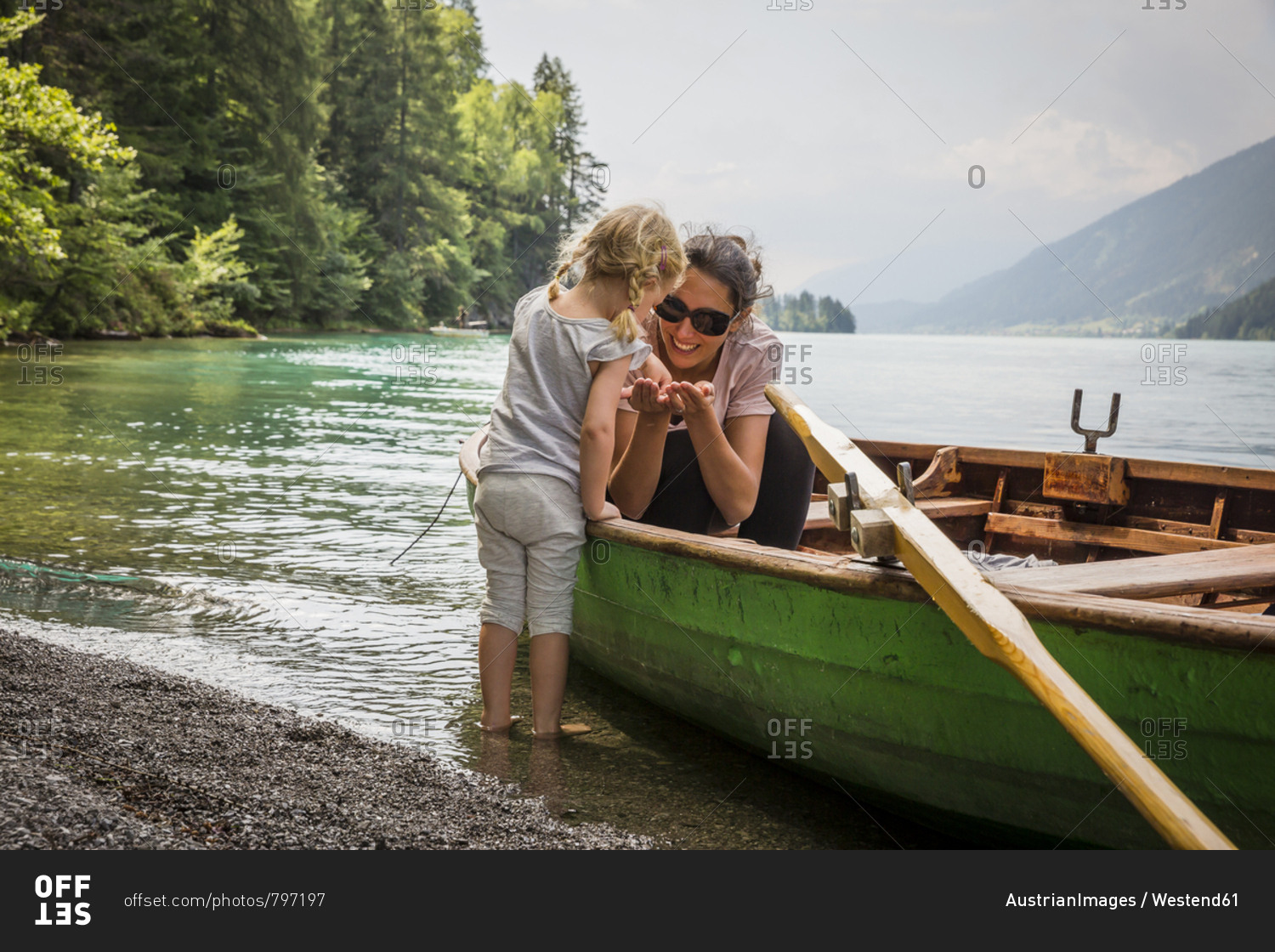 Austria- Carinthia- Weissensee- mother in rowing boat with daughter at the lakeside