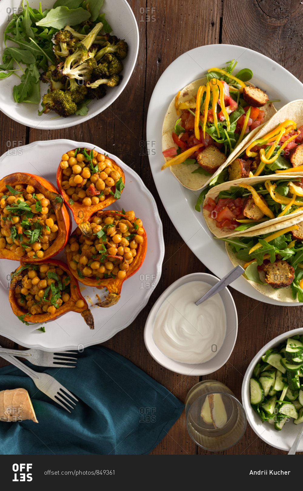 Autumn dinner table with baked pumpkin with chickpeas curry, tortilla with falafel and salad