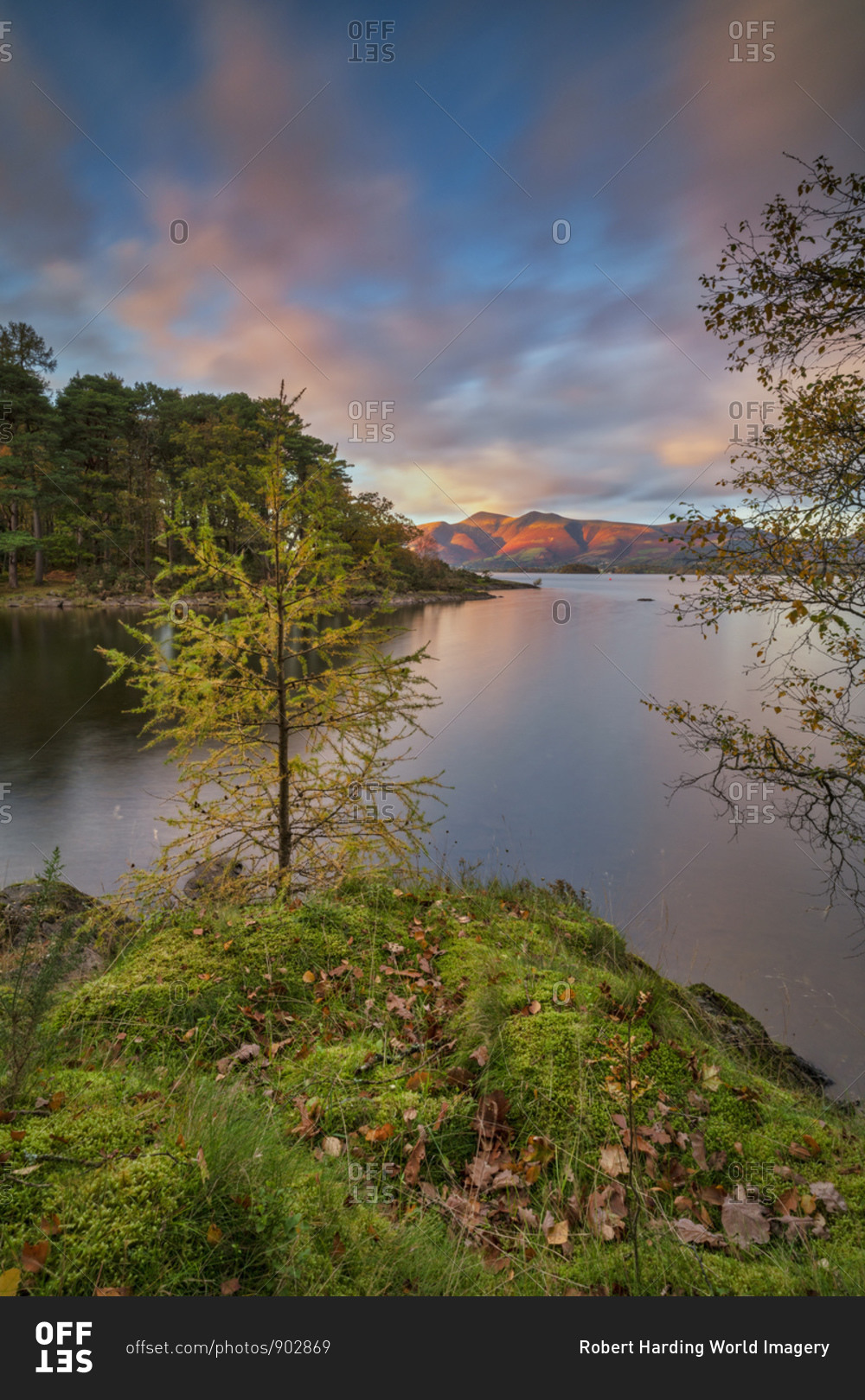Autumn twilight over distant Lakeland Fell, Skiddaw and Derwent Water from Brandlehow Wood, Borrowdale, Lake District National Park, UNESCO World Heritage Site, Cumbria, England, United Kingdom, Europe