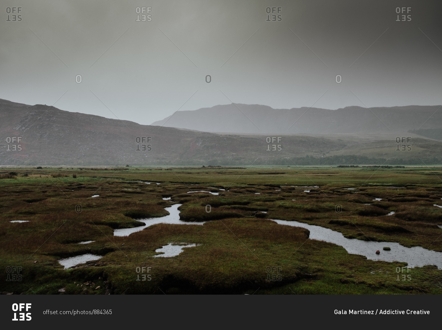 Autumn valley covered with water patches after rain surrounded by foggy hills in Scotland
