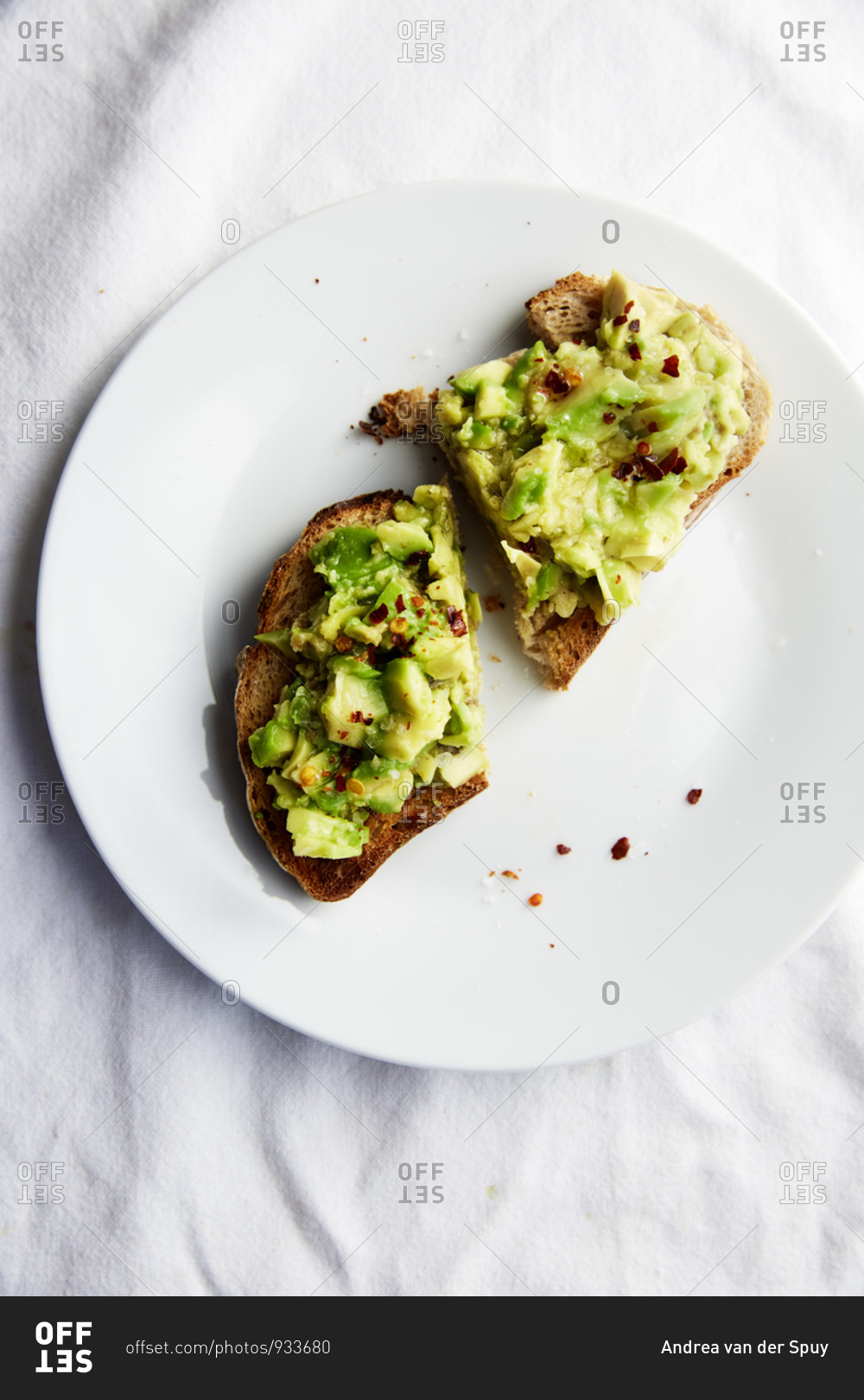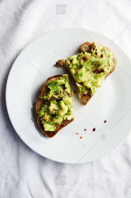 Avo Toast on a white plate and white linen