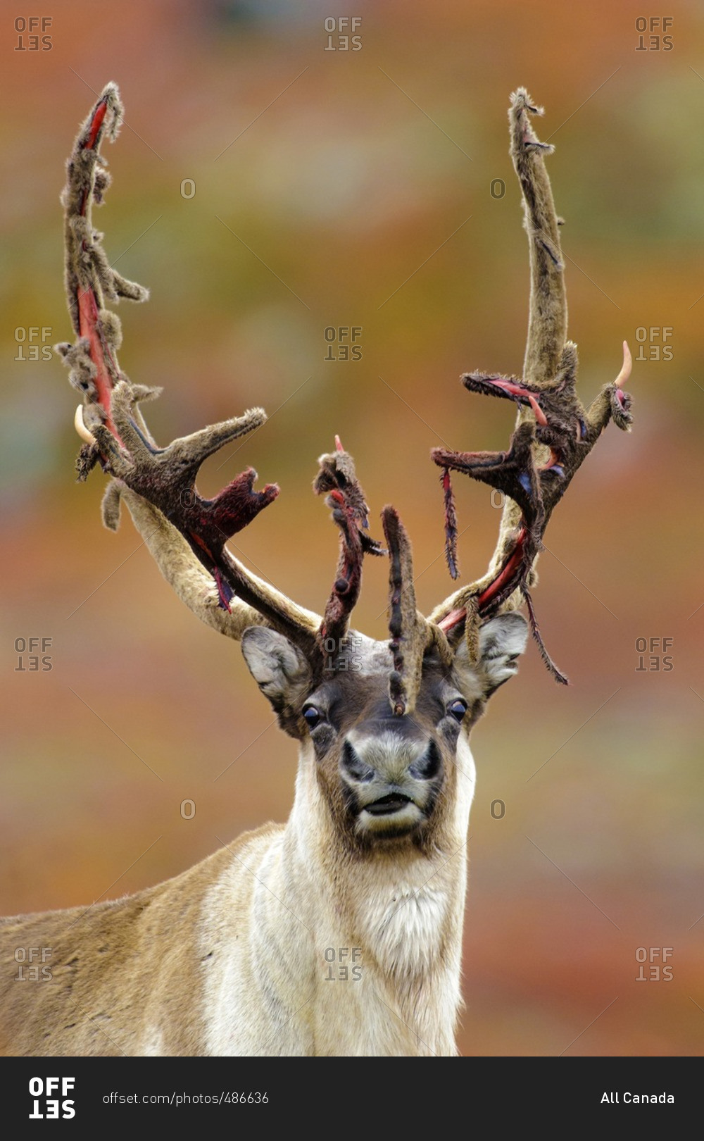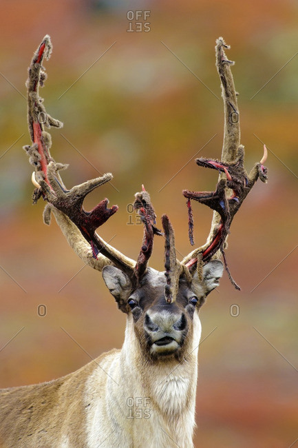 Barren ground caribou bull (Rangifer tarandus) shedding its antler velvet prior to the autumn rutting season, Barren lands, central Northwest Territories, Arctic Canada