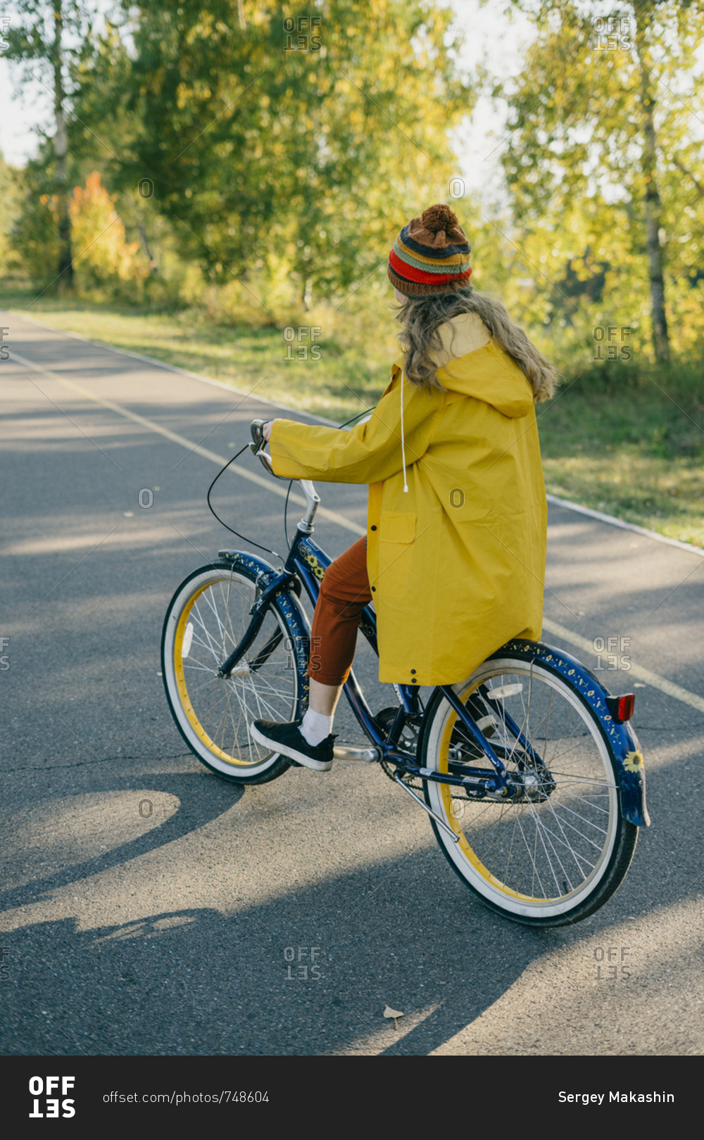 Beautiful young woman in a yellow raincoat riding a retro bike on a path in the park