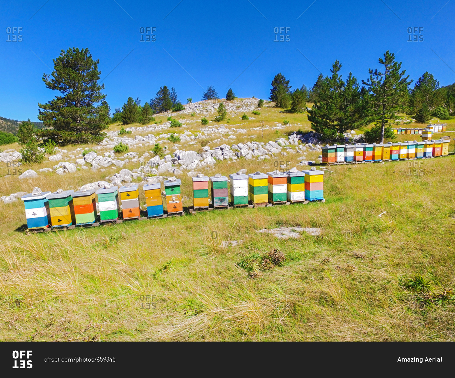 Bee hives on hills of Dinara mountain, Croatia.