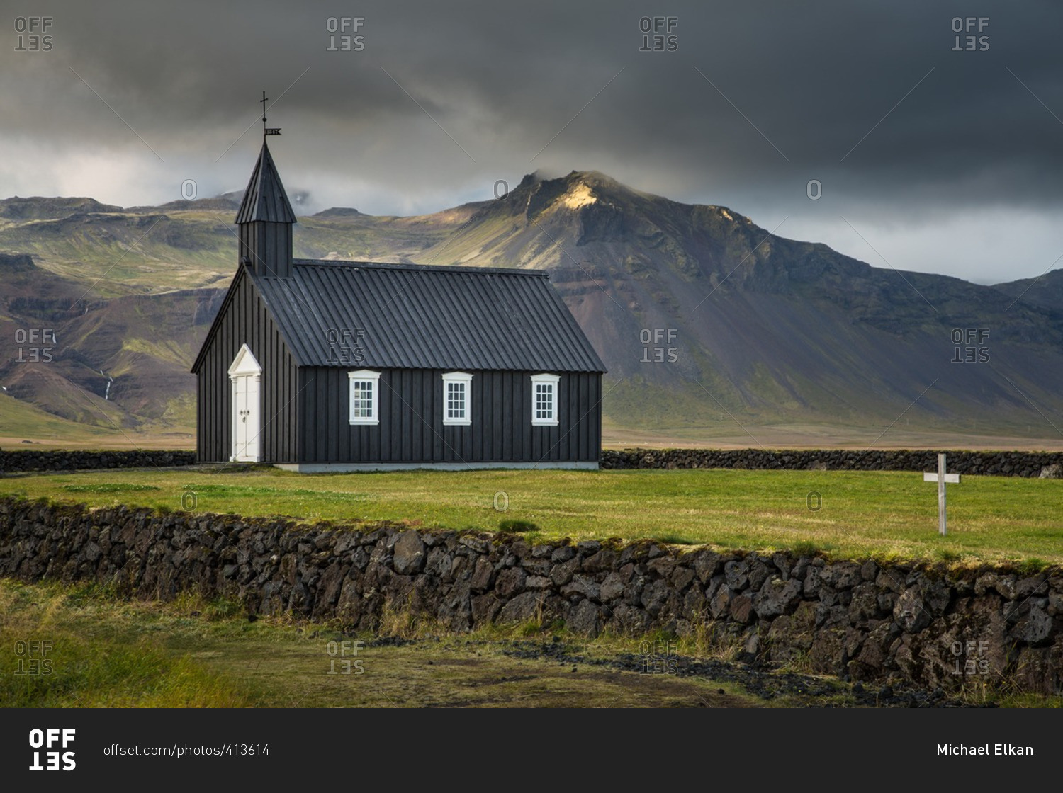 Black wooden church in remote Icelandic location with stormy sky