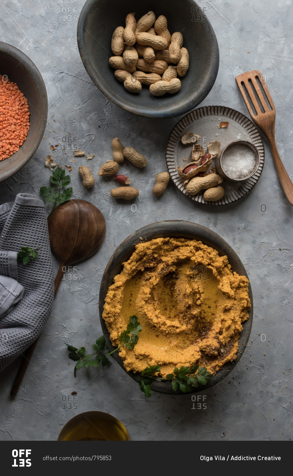 Bowl with delectable lentil hummus with carrot and fresh peanuts standing on gray plaster surface