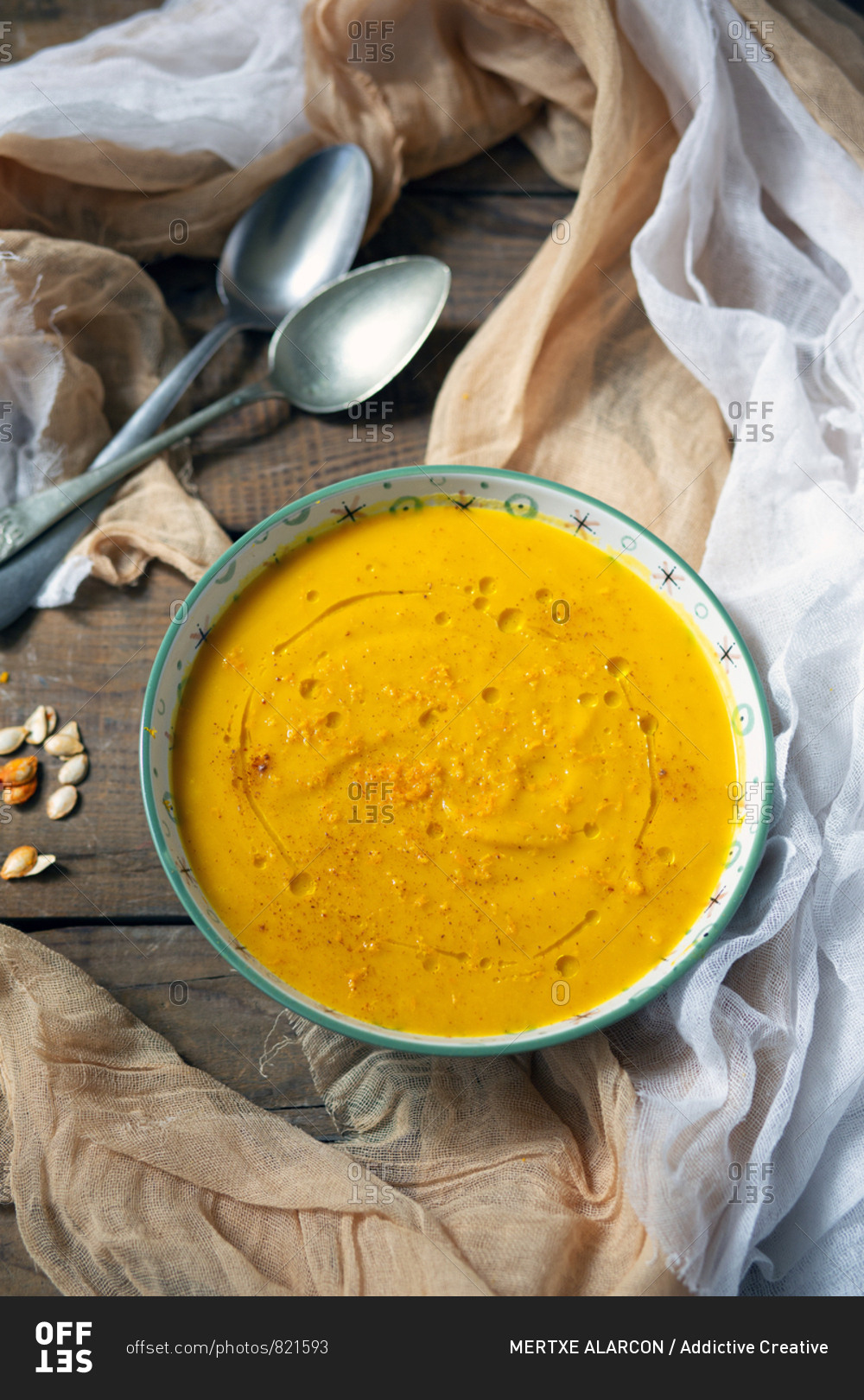 Bowl with delicious pumpkin puree placed on timber tabletop near spoons and napkins