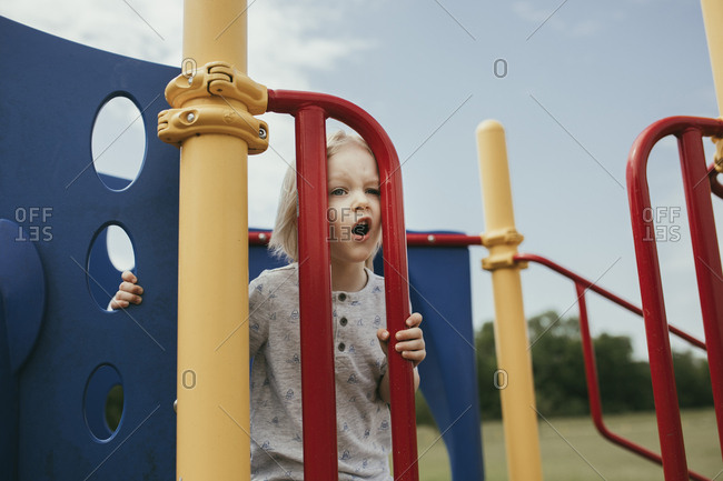 Boy playing on outdoor play equipment at playground