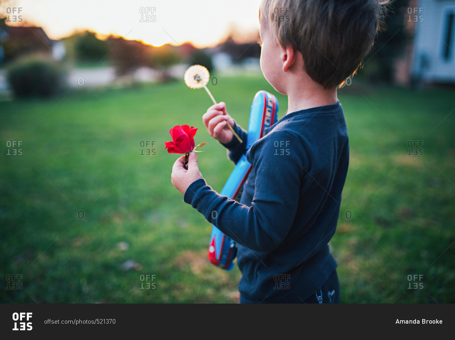 Boy with dandelion in sunrise