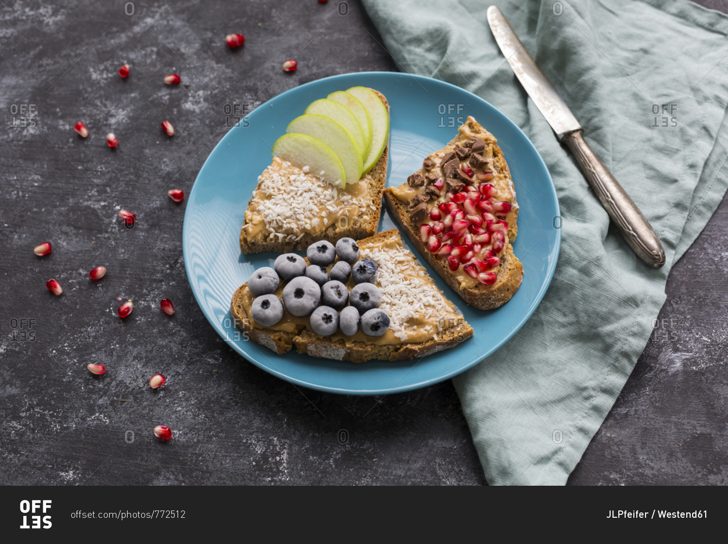 Bread slices with various toppings on plate