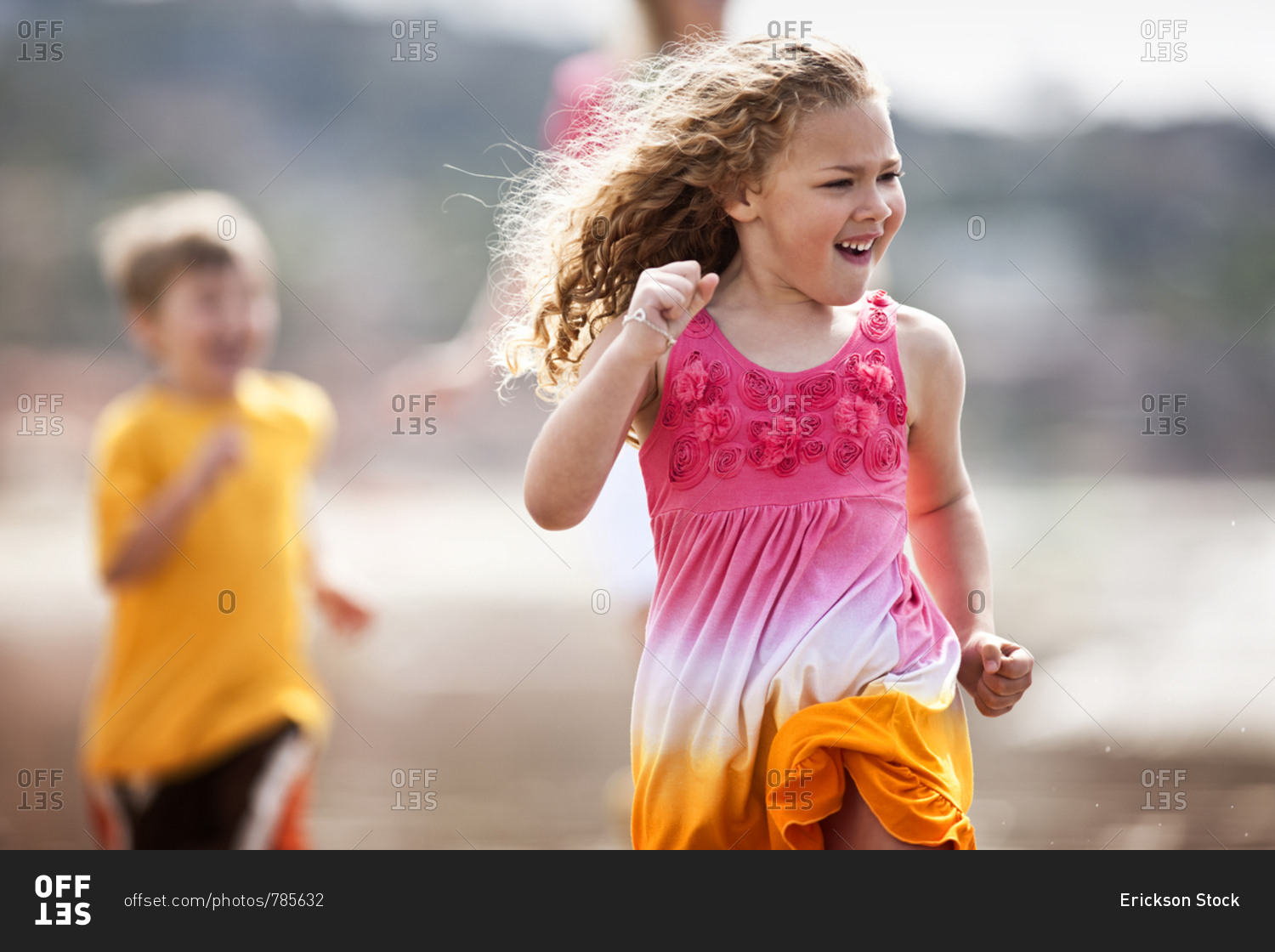 Brother and sister running along the beach.