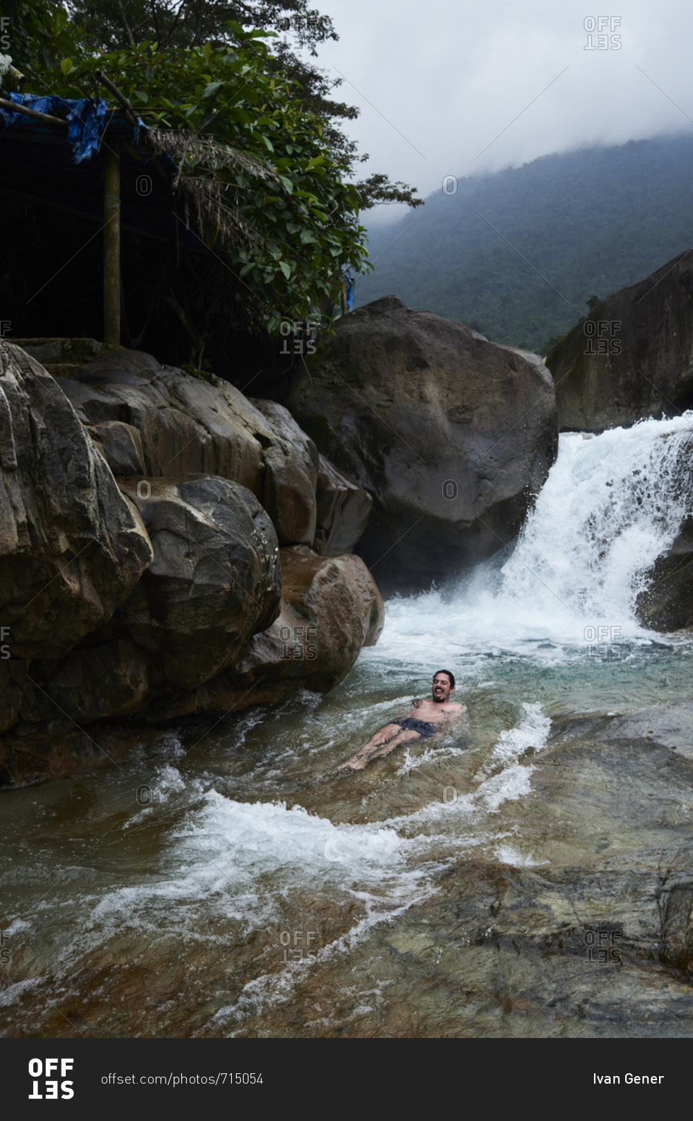 Brunette happy adventurer enjoying the fall down in natural slip and slide waterfall in summer